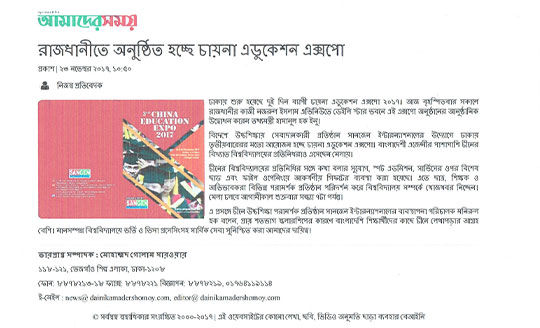 তৃতীয়বারের মতো দেশে অনুষ্ঠিত হতে যাচ্ছে চায়না বাংলাদেশ এডুকেশন এক্সপো-২০১৭। চীনের ৩০ টি বিশ্ববিদ্যালয়ের প্রতিনিধিরা এই এক্সপোতে অংশগ্রহণ করবেন।